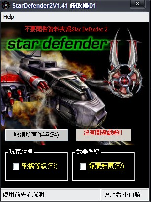 (使用修改器时不要开启资料夹名称为Star Defender 2,不然会抓错。)