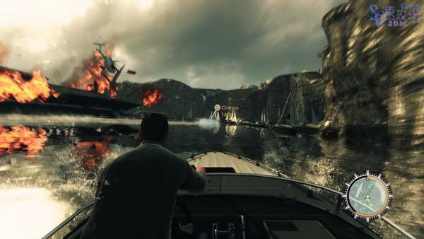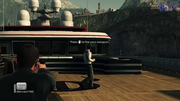 游戏一开始动画中邦德在飞机上跳下来到敌人的游艇,按右键瞄准,左键射击干掉第一个敌人。