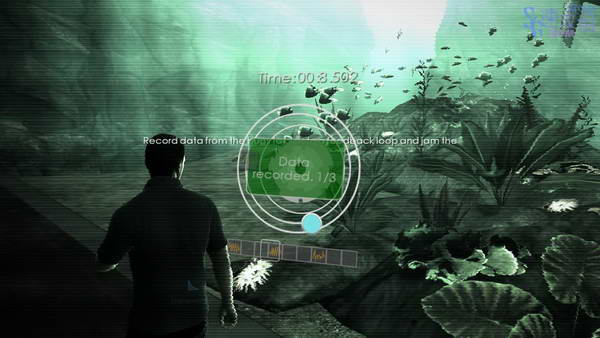 开始后直直走进门,进入大厅中,先要去扫描三个点,分别在正前方的玻璃后边和两边的玻璃后边,使用手机后离近了即可看到,然后扫描即可。
