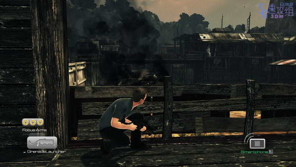 图中这里小心装甲车,在杀光步兵前不要出去,等杀光来步兵再利用掩体跑到桥那里上去,捡起榴弹发射器先给装甲车来一发,然后继续前进。
