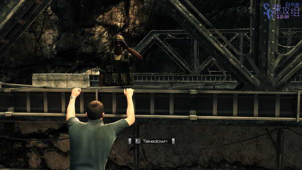 最后通过瞭望塔来到桥身这里,这时候监狱里响起警报,广播里说有人越狱了,然后大部队追了出来,我们顺着桥向左爬,导游破口的地方干掉敌人后上去。