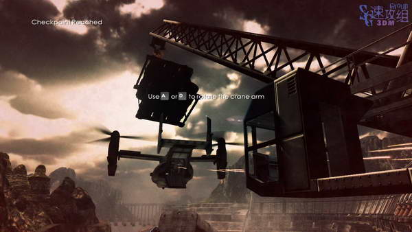 停下后爬到吊车上使用,按S降下钢管砸烂敌人飞机。然后按D向右移动,可以搭成桥,然后下来,过桥。过去后有两个敌人从门里冲出来,干掉后进门从左边的楼梯走。