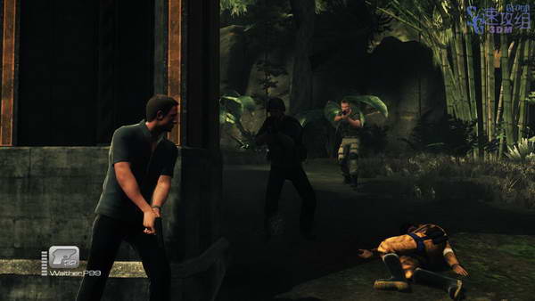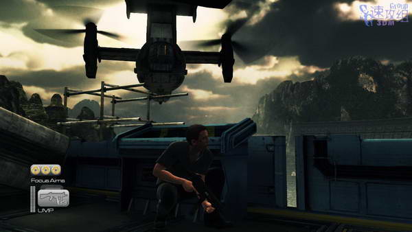 从飞机的尾部跳下去,然后顺着小路上山,之后有几个人逃命下来,被干掉了,找个掩护,干掉敌人,然后继续上山。