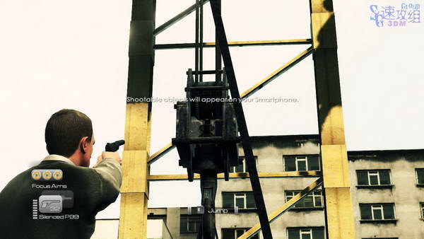 下来之后在掩体后面按F干掉敌人,然后再去干掉远处那个,直接一脚踹下去。