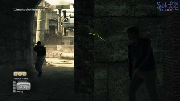 从车里出来后等一个敌人走过来之后CQC干掉,然后干掉远处那个,然后跑到断掉的柱子那里找掩护,干掉另外两个敌人后又有两个人从直升机上下来,干掉后继续前进后还有个敌人,直接干掉继续走。