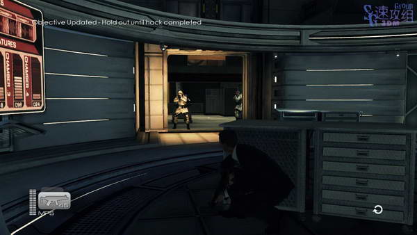 进入目标大楼,在目标门前用手机开门,进入后先干掉走廊里的警卫,然后到图中的位置,两个人在对话,等其中一个过来后干掉,然后破坏监视器,再干掉里边屋里的敌人,然后使用电脑。