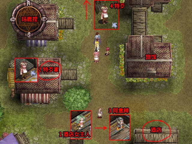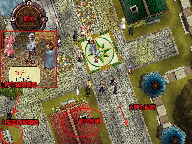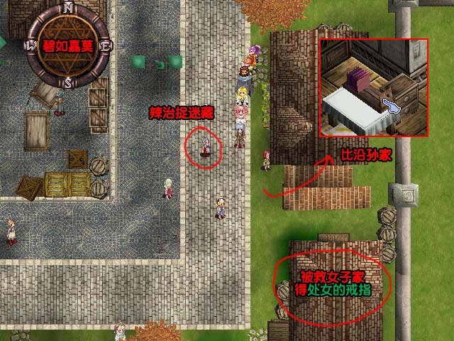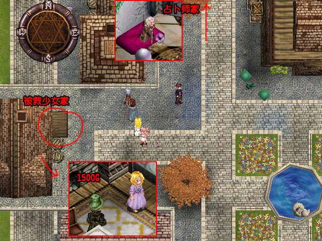 事件:在救出被绑架的人后,回到城拜访可以拿到报答救命之恩的物品,分别在上街区的西边房子(1500G)和下街区的东南房子。