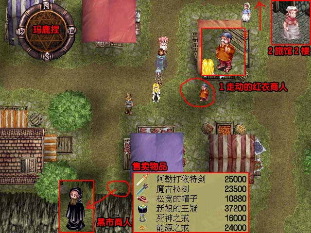事件:先与走动的红衣商人对话得知他要买红茶找不到卖的地方,回旅馆2F与第3间房间奶奶对话,接受托付代卖红茶,再回到商人那,有16G,15G,14G选择,如果选16G会被杀价到只能选13G-得面包×1,应该选15G,如果14G-得力量的源泉×1