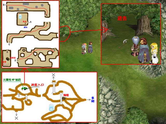 事件:到多姆西边往碧如嘉莫的通路,来到第二张地图时,走道地图中间的桥,会发现上面树林有把斧头,走近会得到火属性MP密药,树林进去会进到秘密洞窟,先存盘,如果在里面动了装投掷武器的箱子,出外便会崩塌,逃出时间为1分钟。