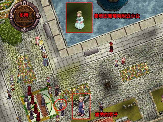 事件:和疲劳的男子对话11次后他会请求你去美若因传话,答应后来到美若因,和葡萄架附近的少女对话,传话完再返回把拉找疲劳的男子。