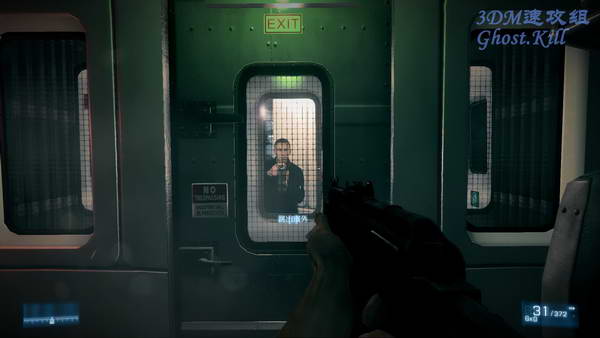 游戏的动作场景不少,至少比起一般的FPS来说是这样。这节车厢尽头被撞了炸弹,爬到窗外跳到前一节车厢上, 然后爬到车顶。