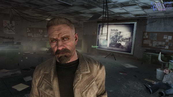 一路上杀过几个房间,图中的房间破门而入后会被敌人放倒,救了我们的居然是Reznov,和他谈完之后离开房间,跑出去跟队友会合。