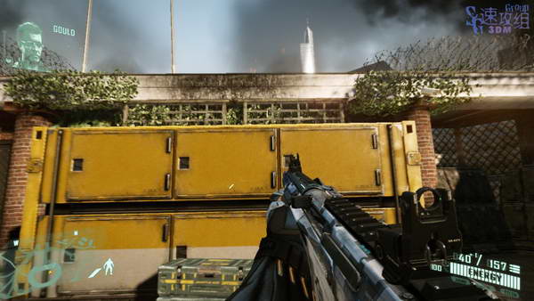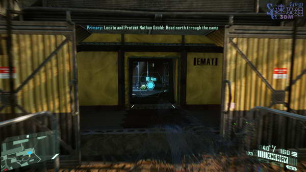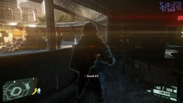 来到室外之后按B切换视觉模式,可以看到两个敌人和弹药补给,跳下去先补充弹药,然后干掉两个敌人,捡他们的枪,然后进入目标建筑。