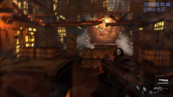 穿过一个四处喷火的楼梯来到楼上,这是一个三层的房间,先把第三层层敌人杀光之后下楼, 到二楼中间的位置后会发生爆炸,路被挡住,进入这个开着门的房间,冲房间里的破洞穿过去。