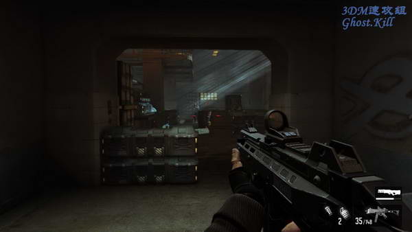 通过尸体身后的门来到图中的房间,显示两个背对自己的敌人,时机把握好的话可以直接在背后用刀杀掉, 而不会惊动其他敌人,也可以直接开杀,这里敌人不少,二层地面看着是铁网,不过子弹穿不过去。