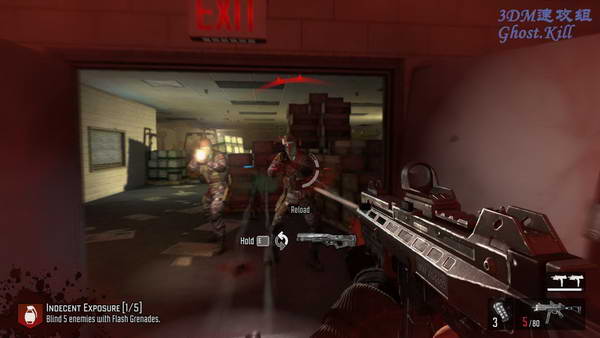 在经过几个房间后听到了正常人的声音,循声过去后只发现了尸体和身上带炸弹的僵尸, 这种僵尸身上闪着红光,有滴滴滴的声音,很容易识别,一枪打在炸弹上就可以干掉。