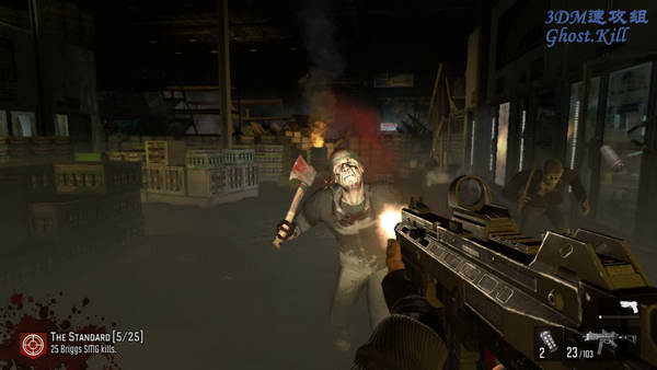 从屠宰间出来后会遇到远程攻击的僵尸,他们从远处向这里扔斧子,精准度和杀伤力都比拿枪的敌人强, 其他还有杂七杂八各种僵尸,从刚出屠宰间的房间躲着,进来一个杀一个,最后再出去解决远程攻击的。