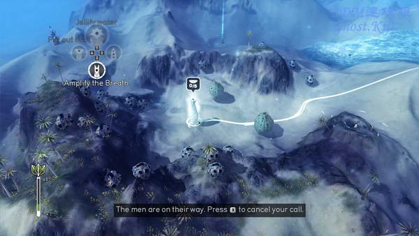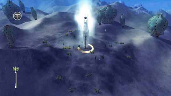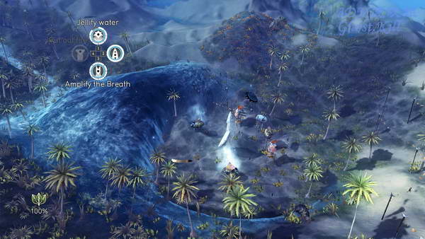 第三个村子也弄成防水的之后去最后的图腾,方法和第三个一样,还是利用地形变化,等没水的时候过去, 建好村子之后拿着石头的人会自动过去,不过这里离着比较远,需要一定的时间,用凝固水的力量拖延时间即可。