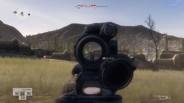 继续去下一个目标点,路上经过的房子里会有敌袭,别贸然冲过去, 现在车后找掩护,干掉院子里的后往屋里扔颗手雷。