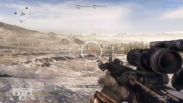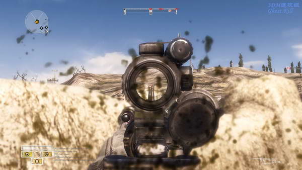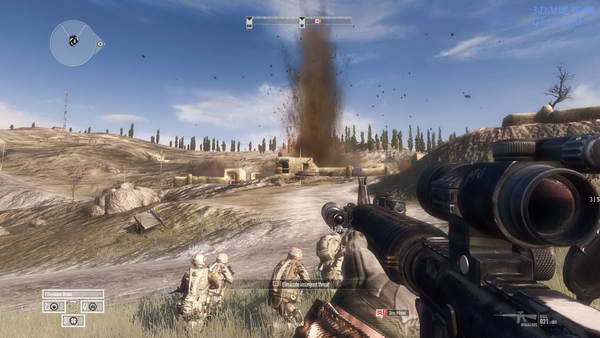 和队友从悍马车下来后去指示点的建筑二层待机,把枪口对准远处的村子, 找好掩护,过一会会有大量的敌人涌出来,命令队友射击。