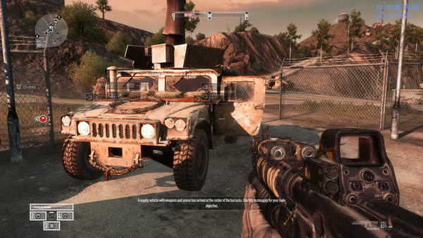 会合地点有弹药补给,过一会友军的悍马车会过来,送来新的补给,拿上标枪后开悍马车走人, 标枪很沉,走着前进和趴着前进一样慢。换出标枪来再上车。