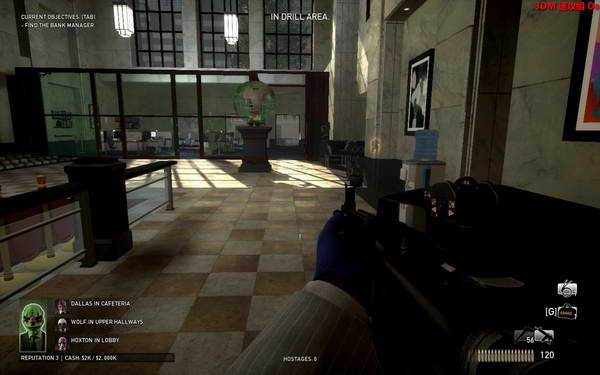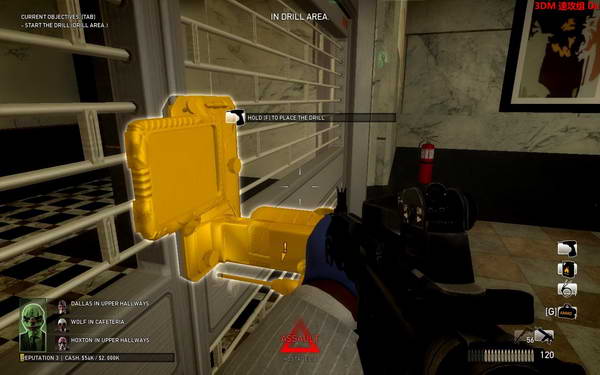 期间要去2层黑掉银行电脑,会有!号指示!电钻会坏的,所以不要顾着和警察交火而忘记修电钻
