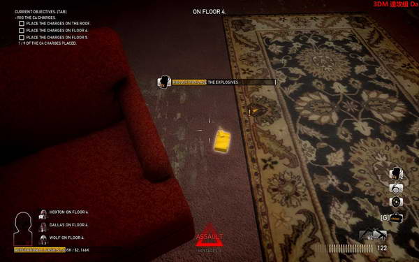 去到C4包那里捡C4,每次只能捡3个,要安装9个位置。会有高亮指示!