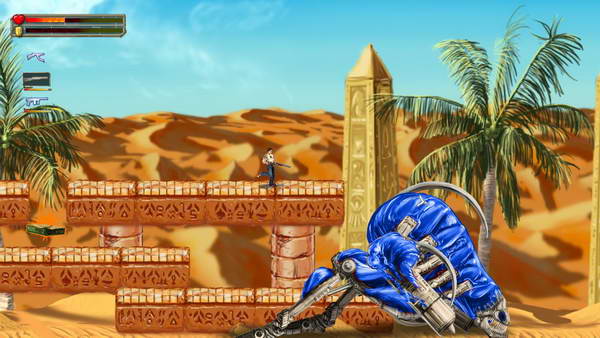 别以为渡过了这个山洞就离通关不远了,当初我就是这要么以为的,结果高兴过早了。。之后才遭遇了真正的BOSS,如图,就是那个蓝色机甲怪兽
