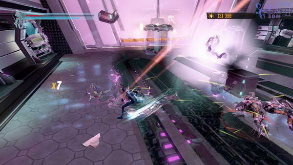 干掉全部怪物,体型大点的会瞬移,等他瞬移后回到空中浮着的平台上狙击我们,看到有激光向这里瞄准的话就子弹时间, 切换视觉模式找到他把他踹下去。小怪都可以一下秒杀,不过他们会自爆,要小心。