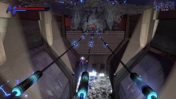 进门后是BOSS战,直接攻击他,看他掉血的话就接着打,不掉血的话就躲开,他攻击的时候我们只能躲开, 一般攻击只要从平台上下去就能躲开,等他到两边的发电机上时我们用蛛丝飞过去踢他即可,没血之后他会逃走。