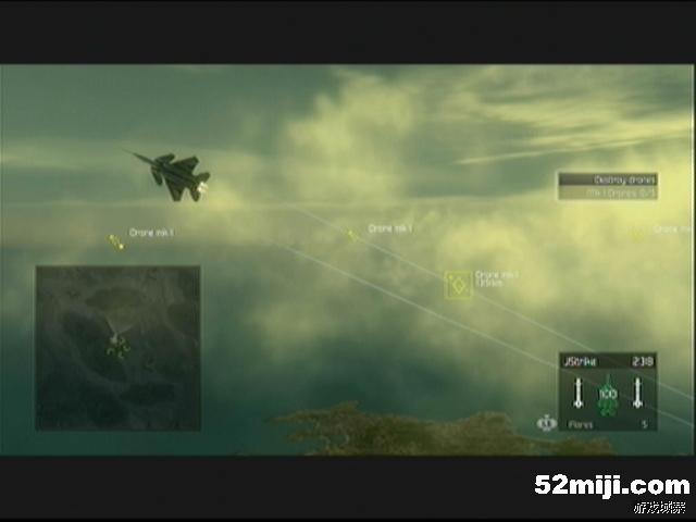 任务开始后,首先爬升到3000米之上,然后连点RT或者LT进行远视点的切换,之后任务更新,按住LT减速,直到飞机失速,之后迅速按RT重新加速即可。玩家需要用这种远视角模式先后摧毁几处静止和移动的无人机,注意会移动的无人机会跟在玩家后边,玩家应该利用减速来减小盘旋半径,从而令机头迅速指向目标,再加以锁定。最后出现3架会发射导弹的无人机,同样合理运用减速和失速让敌人机体处于前方后击毁,任务5顺利完成。