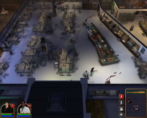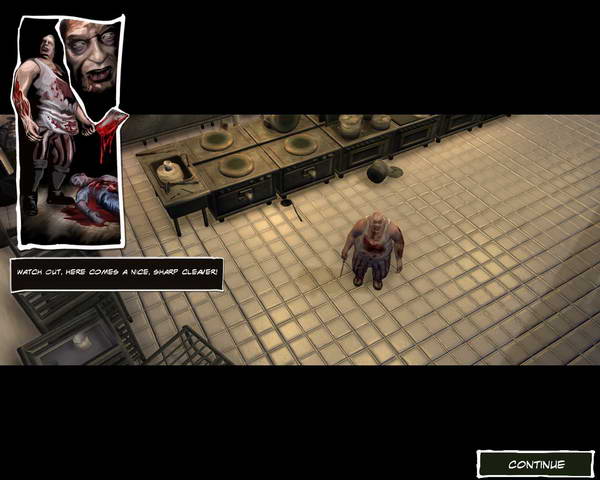 然后回到我们刚进来的地方,进入左边的门,来到食堂。这里非常空旷,在左边的小道尽头有一些弹药。右边的厨房会遇到游戏的第一个BOSS,一个变成丧尸的厨师。这里可以先站到门口,等BOSS走到灭火器旁边的时候射击灭火器,灭火器爆炸可以给BOSS造成非常大的伤害。干掉BOSS后从厨房后门出去。这是医生果断开枪干掉了主角受伤的伙伴。然后给震惊中的主角解释,被丧尸咬到的人是没救的。这样第二关结束。
