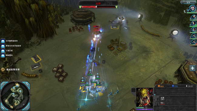 消灭完冲上来的兽人即可继续往北消灭头目。来到下图的拐角处,这里一定要抢先占领中间的堡垒,然后让重力小队驻守在里面进行攻击。这样就可以很快的消灭掉周围的兽人步兵