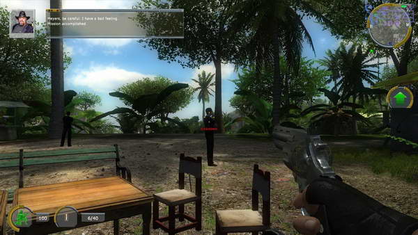 屏幕右上角是小地图,按TAB可以放大,去地图上的绿旗点,按2换出左轮手枪,达到目的地后干掉三个守卫, 捡起他们的装备,然后进入目标房间和Jose交谈,得到新任务。