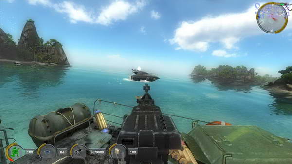 游戏开始之后我们在游艇上,正在悠闲的时候几船的敌人外加两架直升机出现,二话不说的就向我们射击, 控制机枪干掉敌人。机枪没有准星,屏幕中央对准敌人射击就可以,看机枪的着弹点也可以。