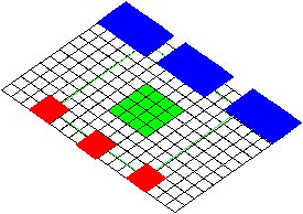 以下图为例,中央绿色方块是主基地,那么在它四周可以放置建筑物的范围就是以绿色线段线围成的菱形范围。只要需要摆放的建筑物的一个角或一个边在这个范围内就可以摆放下去!如红色的方格都可以放下兵营,蓝色都可以放下重工等(下图)