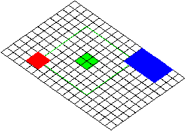 在《红色警戒》的建筑物中(以苏军为例,下同),主基地占4×4的格,电厂2×3,兵营2×2格,重工3×5格,矿厂3×4格,维修厂3×3格,作战实验室2×3格。经过本人细心研究,建筑物延伸是有规律可循的,即:在各个方向都可以延续三格。所谓各个方向就是指对角线和边上都是三格。