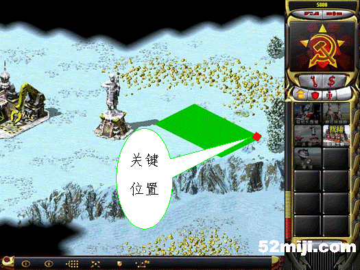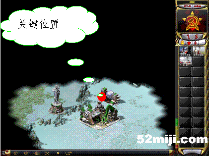 再举一个例子:岛屿之战中,如果分在右面的位置,有人喜欢将重工放在坡上,但是必须将矿厂放在如图的位置才可以。而图中红色点即为关键位置,只要那个地方有建筑物,重工就可以放到坡上。