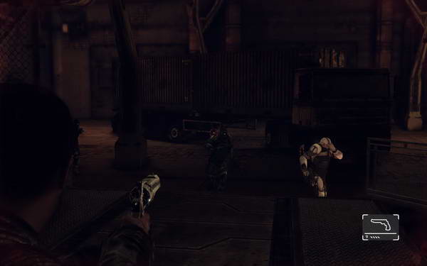 本关开始后需要前进捡起手枪把对面敌人击杀之后升降梯下去的途中对面还会上来两名敌人击杀(后方货柜有霰弹和近战)