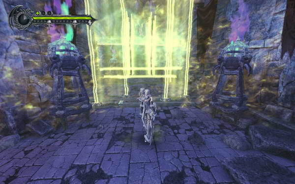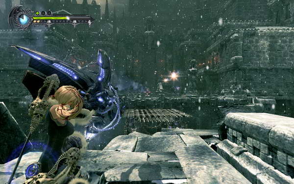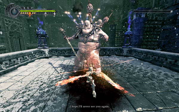 4.遇见第一个小BOSS,是第二章的火焰法师,用枪是无法造成伤害,只要近身战斗他会释放大范围击退技能,打几下就退到边缘,掌握时间间隙,不断进退,别被击飞到平台下摔死,还是很容易的。