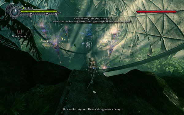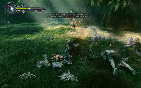 3.桥上的BOSS也没有难度,掌握规律躲开火焰魔法,顺利过关。通过连击能量积累骷髅(左上方),击打的过程中按1 2 3键会有相应的冰、火等魔法攻击锥形范围内的敌人(这招是常用技能要熟练使用)。