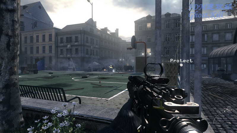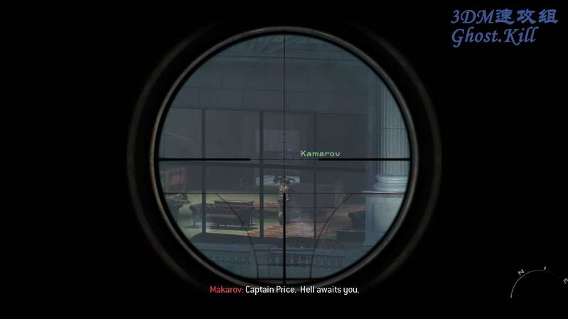 按W放大狙击镜,干掉阳台上的几个警卫,等普莱斯突入房间后帮他干掉房间里的敌人。