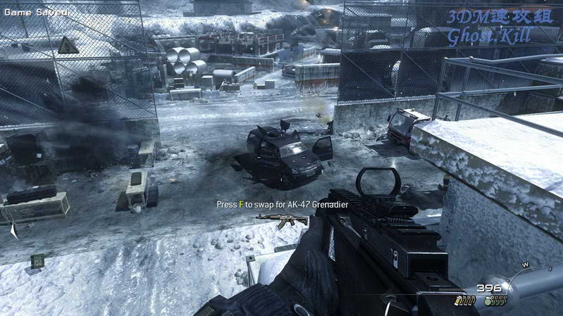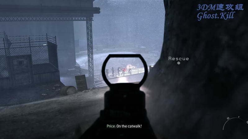 经过几个房间来到室外,杀光楼下的敌人后友军坐直升机来支援,按4使用AGM导弹清路,不过一会UAV被打了下来, 不能用AGM了,干掉远处比较显眼的敌人,等待友军直升机火力掩护冲进室内。