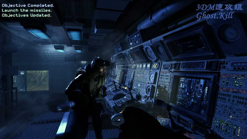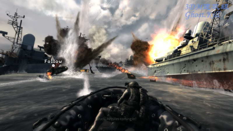 等敌人的潜艇过来后在它尾部安装炸弹,引爆之后潜艇浮到了水面上,爬到潜艇顶部干掉几个敌人, 然后跟着sandman进入潜艇的内部,见人就杀,任务很简单,就是启动导弹系统让敌人自相残杀。