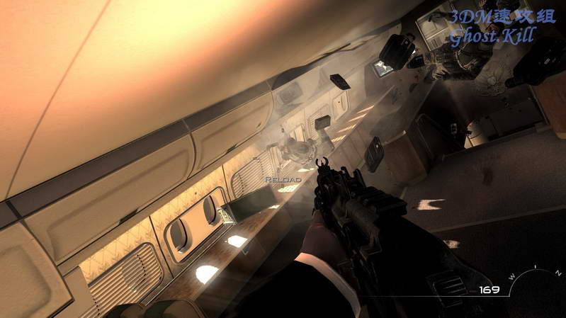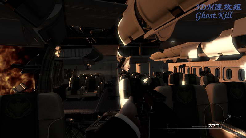 一路杀到飞机比较靠中部的为止找到总统的女儿,保护起来之后继续去下一个房间杀敌人,这次还没等着把敌人杀光, 飞机的机身就断裂开了,后半个机身直接飞了出去,前半截随后也一样坠毁。