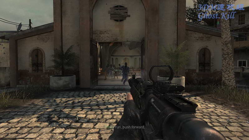 一路杀敌来到目标的教堂,到门口的时候门自动打开,冲出来几个敌人和几只狗狗,数量不少,可以先扔震撼弹, 虽然不知道对狗狗管用吗。
