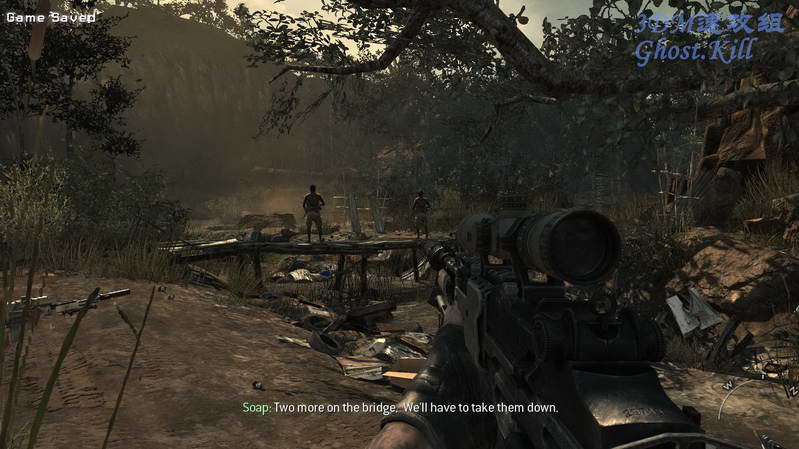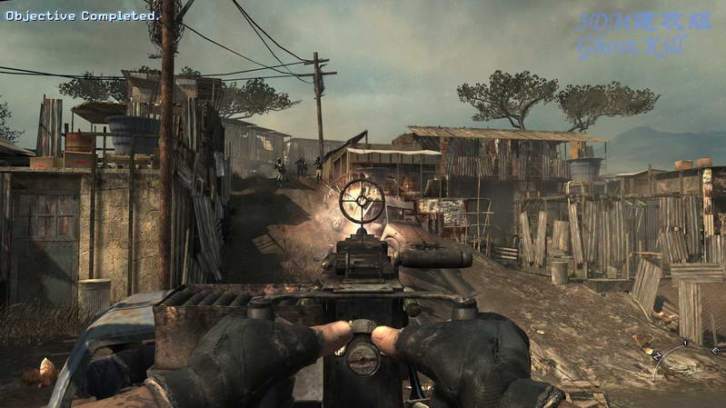 杀光敌人后换成AK过去和他们汇合,肃清这个村子。爬梯子来到另一边的路边,把干掉卡车上的机枪手, 然后过去使用机枪把周围敌人扫死,优先攻击敌人载具,这不需我多说了。