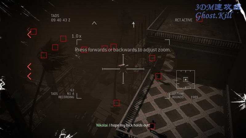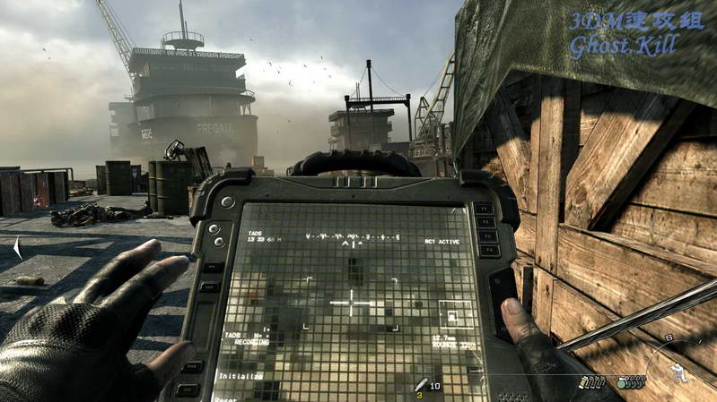 坐车去找可能会知道马卡洛夫下落的家伙那里,直接从正门冲进去,空中有尼克莱的直升机掩护, 按4可以使用直升机上的机炮,威力极强,不会过热,热成像视觉,敌人有红框标记。