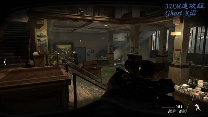 补充下弹药之后肃清整个区域的敌人,数量非常多,建议进入餐厅正对面的房子里打,小心楼梯上的RPG敌人, 全部杀光后来到这个楼梯这里,下边敌人非常多,还有载具,按4拿出烟雾弹扔到敌人最多的地方指示AC130炮击。