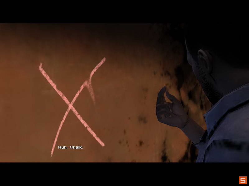 他说在大门口发现了粉笔的痕迹,并且跑到门口摆了个欠抽的pose要和主角击掌~